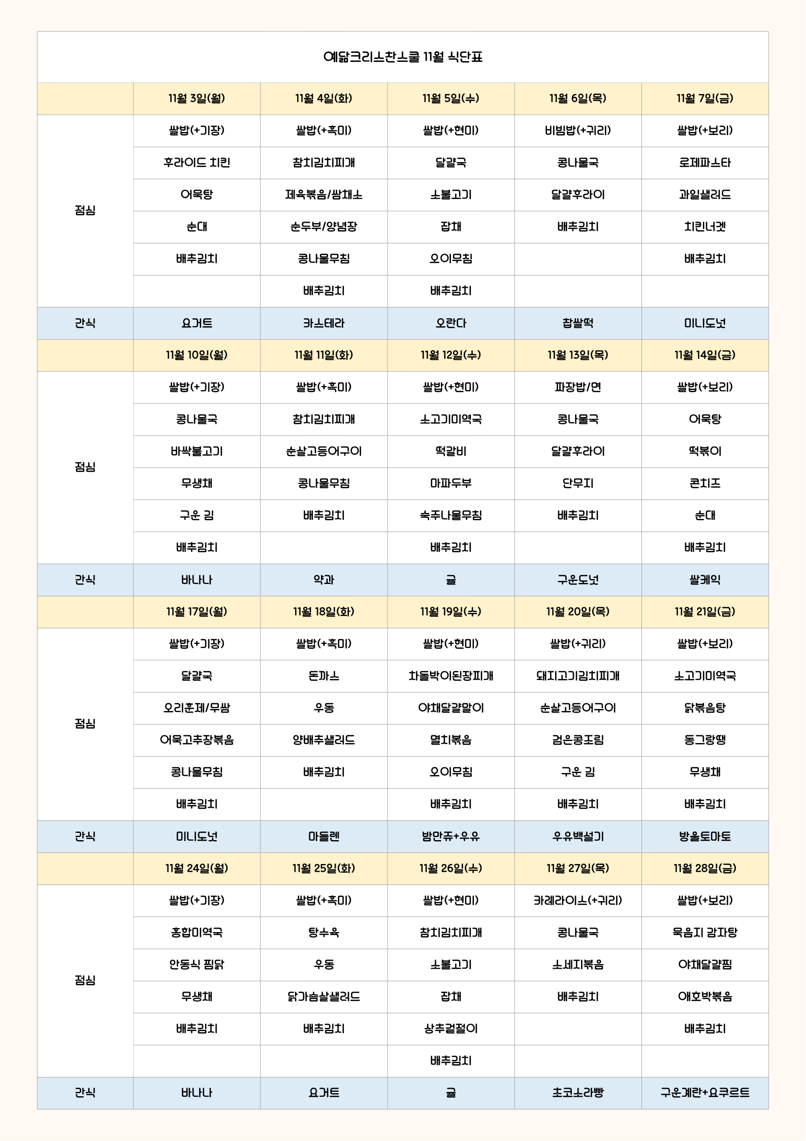 11월 식단표 관리자 25-11-03 16:38 페이지 정보 목록목록 본문 . 이전글[이번 주 성경암송 말씀 안내]마태복음 5장 12절 25.11.10 다음글[이번 주 성경암송 말씀 안내] 마태복음 5장 11절 25.11.03 댓글 0 댓글목록 등록된 댓글이 없습니다.